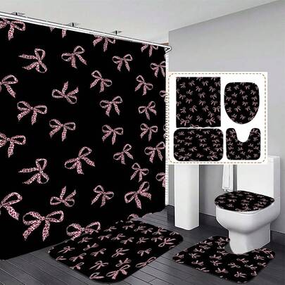 1/4 件套蝴蝶结印花浴室帘套装 - 设计精美,纯黑色背景,精致线条艺术细节,浴缸隔断帘,浴室地垫套装(含马桶盖、浴垫和地毯),70.9 英寸 x 70.9 英寸,配有 12 个挂钩,易于安装,可水洗涤纶材质,家居装饰,浴帘,时尚浴室配件,优雅浴室装饰,经久耐用 - 四季皆宜