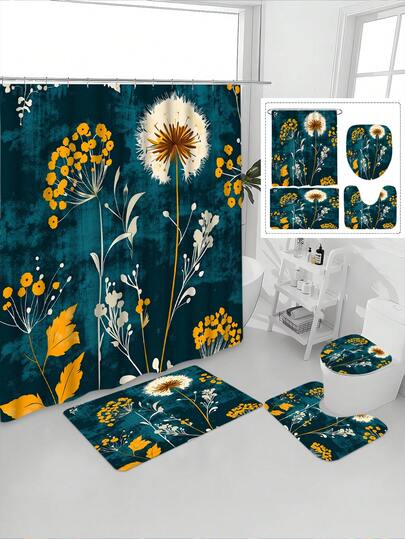 1/4 件套波西米亚风花卉主题浴室装饰套装,包含浴帘、浴垫、U型马桶垫、马桶盖套、防水浴帘、现代风格浴室隔断帘,无需钻孔,涤纶材质,可机洗 - 花卉 - 查看 10