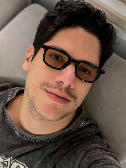 1副男士窄框方形时尚眼镜,经典黑色聚碳酸酯镜框,蓝色和茶色镜片,休闲风格,轻便,适合旅行和驾驶,带眼镜盒