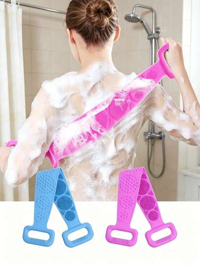 1条装 70x11厘米/27.6x4.33英寸 硅胶背部按摩带,双面去角质身体刷,硅胶沐浴带,现代简约风格,蓝粉色,长款带状设计,符合人体工学手柄,可折叠可拉伸,淋浴时深层清洁,背部去角质,去除死皮