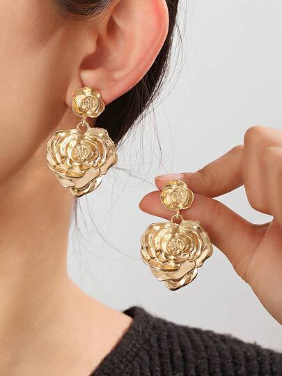 1对精致简约复古心形玫瑰花优雅法式耳环 - 金色 - 查看 1
