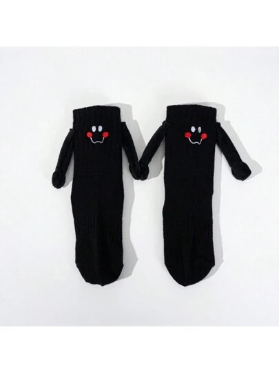 1 雙家庭風格卡通笑臉刺繡手拉手有趣黑色/白色中小腿襪子適合 1-8 歲 - 黑色 - 查看 1