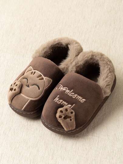 1 双儿童卡通布艺拖鞋,可爱猫咪图案,温暖室内家居服,防滑厚布鞋(建议订购大一码) - 咖啡棕 - 查看 1