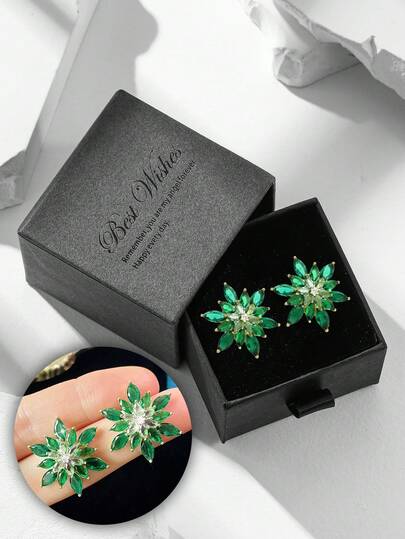 一对奢华立方氧化锆雪花耳钉,祖母绿宝石首饰,女士派对晚宴必备,铜质,低过敏性且不易褪色,绝佳礼品之选 - 金色-祖母綠 - 查看 1