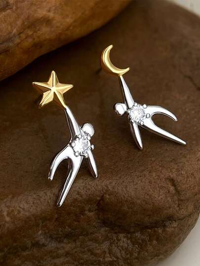 一对925纯银针星月锆石耳环,可爱星月小人儿耳环,适合女性日常佩戴,母亲节、感恩节、生日礼物