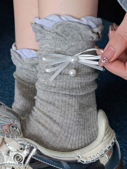 1双夏季薄款甜美珍珠纯色蝴蝶结袖口女士袜子 - 彩色 - 查看 1