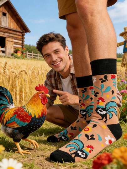 1双男女通用彩色公鸡图案中筒袜,运动户外袜,适合所有季节,春夏皆宜,情侣袜 - 彩色 - 查看 1