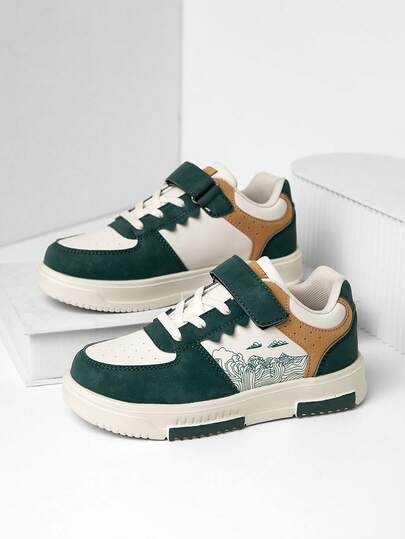 1双多功能魔术贴舒适透气儿童休闲运动鞋,随机风景印花装饰撞色拼接,校园学生时尚滑板鞋,男女童跑步运动鞋 - 綠色 - 查看 1