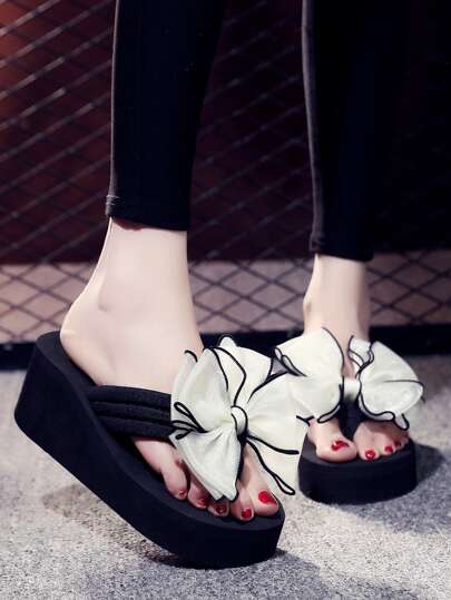1 双女士蝴蝶结厚底时尚人字拖高跟凉鞋,夏季 - 黑與白 - 查看 9
