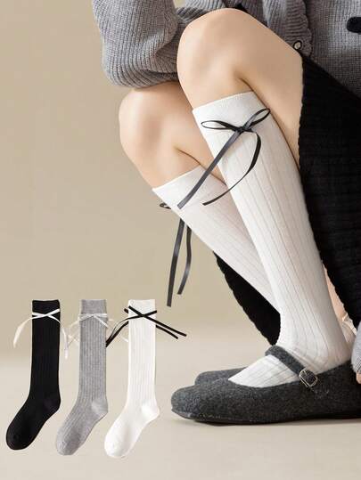 1双女士过膝袜,白色蝴蝶结JK款竖条纹修身长筒袜,简约芭蕾舞风格纯色袜,适合日常穿着 - 彩色 - 查看 1