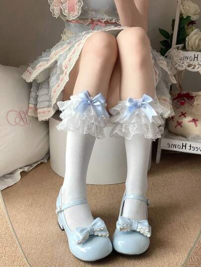 1双女士春夏薄款可爱洛丽塔蕾丝荷叶边蝴蝶结过膝袜,适合派对和日常穿着 - 白色 - 查看 1