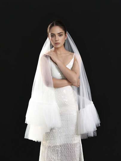 1 件装新娘短款头纱,多层荷叶边蕾丝,白色、黑色或裸色薄纱蓬蓬裙,适合秋季拍摄,女士情人节配饰 - V183 - 查看 1