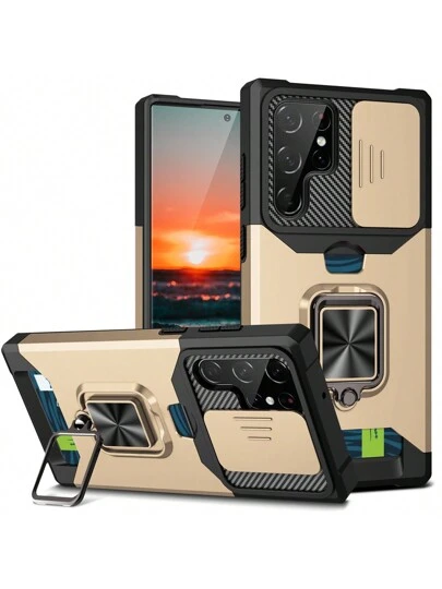 1 件金色支架盒和卡夹,重型外壳带滑动相机盖,磁性环支架,超薄防震保险杠坚固保护 [兼容磁性车载支架] 坚固耐用 - 金色 - 查看 7