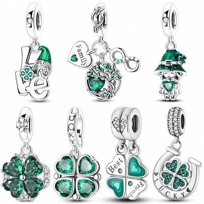 1 件银色闪亮绿色立方氧化锆幸运四叶草马蹄铁爱心精灵家庭生命树吊坠,适合搭配原装手链项链吊坠珠,用于 DIY 首饰制作,是女士圣帕特里克节珠宝礼物的理想之选 - 日常珠宝配饰 - 銀色 - 查看 18