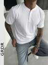 男士白色花卉灰色亨利领短袖T恤,亨利领设计,针织面料透气吸湿抗皱,复古风格休闲舒适短袖T恤,适合日常通勤和轻度社交场合穿着。