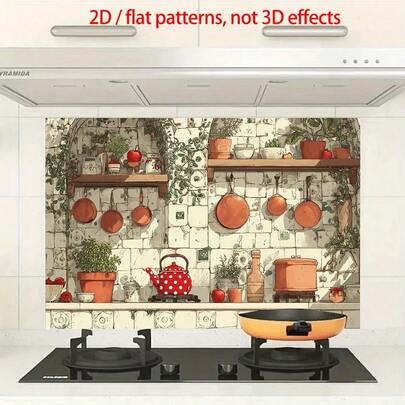这款单片式2D平面设计厨房墙贴,以经典的橱柜配色和摆放在架子上的各种厨房用具为特色,营造出怀旧的氛围。它易于粘贴,经久耐用,采用PVC自粘纸制成。