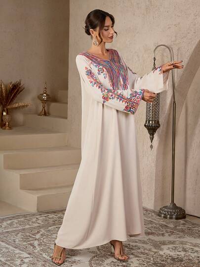 一件装女士穆斯林亮片刺绣长袍罩袍连衣裙,端庄阿拉伯长袍 - 杏色 - 查看 9