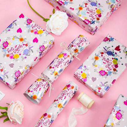 1卷母亲节礼品包装纸 - 母亲节快乐花卉和箔纸爱心图案,17英寸 x 32.8英尺,粉色箔纸
