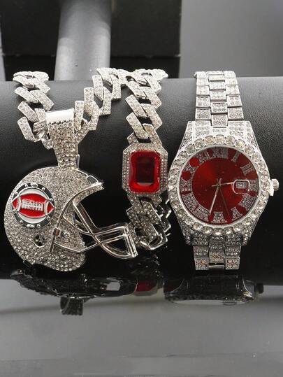 一套3D全钻橄榄球头盔吊坠项链、手链、手表套装,时尚奢华礼盒包装,适合送礼。
