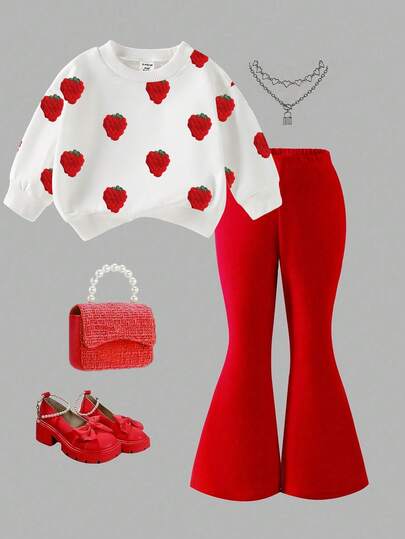 1 套女婴休闲时尚甜美可爱草莓印花白色圆领运动衫和红色喇叭裤套装,秋冬女婴运动衫套装,草莓运动衫和裤子两件套休闲装 - 彩色 - 查看 1