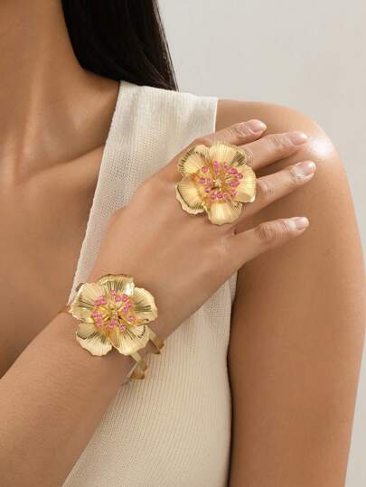 1 套波西米亚风格百搭塑料水钻花朵金属手链和戒指,适合女士日常佩戴和正式场合,很棒的礼物 - 彩色 - 查看 1