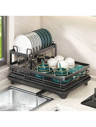 一套碗碟架,双层碗碟晾干架,防锈厨房碗碟晾干架,带沥水板和餐具架,适用于厨房台面,厨房配件 - 黑色 - 查看 1