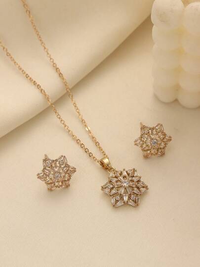 1 套精致紧凑型铜合金锆石雪花吊坠项链和耳环首饰套装,适合女性日常使用或送礼 - 金黃色 - 查看 1