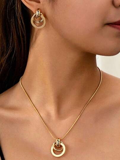 一套时尚几何圆形金属项链和耳环首饰套装,送给女朋友或闺蜜的百搭礼物