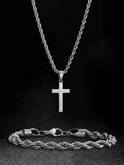 一套男士不锈钢十字架吊坠项链和休闲链手链首饰,适合所有季节佩戴,无窒息危险 - 彩色 - 查看 1