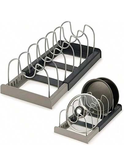 一套7+个可伸缩锅具架,适用于橱柜和台面,配有7个可调节隔板、防刮垫,以及锅盖收纳架,可用于存放炊具和烘焙用具,厨房配件,厨房用品,厨房工具 - 黑色 - 查看 11