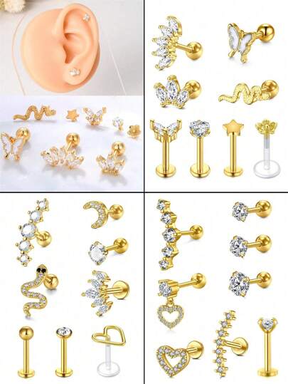 CIZME 8 件/套软骨耳环耳轮穿孔首饰女士不锈钢蛇花蝴蝶心月亮星星 CZ 海螺耳甲耳屏穿孔首饰螺丝背耳钉,软骨耳环不锈钢耳钉平背软骨海螺耳轮穿孔首饰女士,耳轮耳环女士平背软骨耳环不锈钢平背耳钉唇钉海螺耳轮软骨耳屏穿孔首饰 - 金黃色 - 查看 8