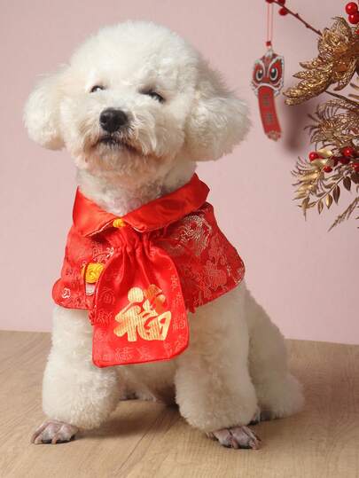 一套涤纶唐装围巾和红包,节日风格,适合小型宠物 - 紅色 - 查看 5