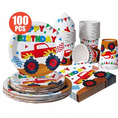 一套赛车主题怪兽卡车一次性餐盘、餐巾纸、纸杯,适合25位客人使用,一次性纸盘,派对用品,适用于生日、婚礼、主题派对、家庭野餐 - 彩色 - 查看 1