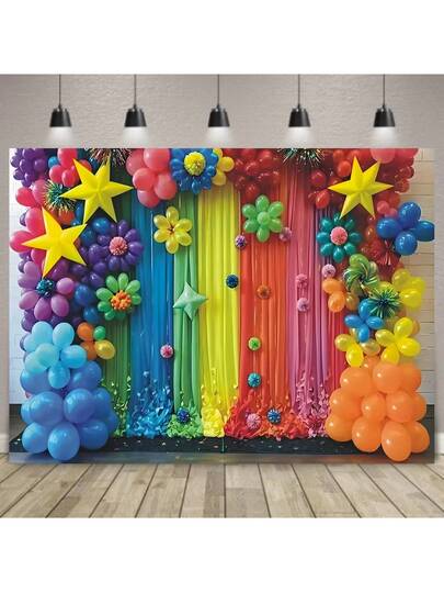 1. 色彩鲜艳的气球和星星摄影背景 - 彩色毕业典礼、生日派对横幅,带有黑板和铅笔设计,适用于教室装饰、家庭合影和活动装饰、毕业派对装饰 - 彩色 - 查看 8