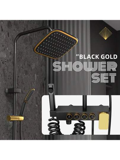 一套复古黑金淋浴套装,配有多功能水龙头和储物架,适合家庭浴室使用。浴室配件,浴室工具 - 黑金色 - 查看 1