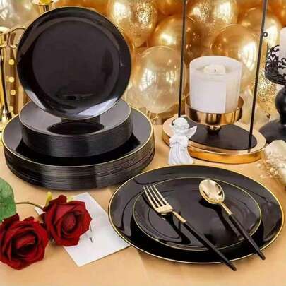 10.25英寸黑边大餐盘和7.5英寸黑边小餐盘套装,金色镶边沙拉盘、蛋糕盘、水果盘、派对餐盘、餐具套装,适用于生日、派对、宴会、节日派对、新年庆祝活动、餐饮活动等场合。