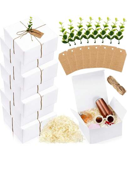 Meching 10入組8件伴娘禮物盒,尺寸為8 X 8 X 4英寸,附帶8張牛皮紙禮物標籤、8支塑料尤加利葉花莖、1盒彩色紙屑填充物和1條麻繩 - 白色 - 查看 1