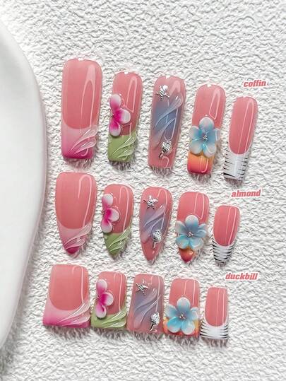 10Pcs Gentle, Girly Style Handmade Nail Art Set,Polygel Nail Set,Starfish, Sea Snails Nail Art Accessories,Hand Sculpted Five Petal Flower And Stripes Nail Art Decorations,Green, Blue And Pink Purple Nail Polish,Vibrant Summer Style,Comes With Nail Tools(1 Sheets Jelly Stickers+1PC Nail File)3 Sizes Available,Almond Nails, Duck Nails,Coffin Nails,Suitable For Reunion,Daily,Party,Photograph,Play,Spring Summer,Commute Supplies Nails