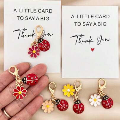 10个/5套可爱瓢虫花朵合金钥匙扣套装,心形感谢卡(含钥匙扣) - 龙虾扣,耐用锌合金 | 适合学生、同事、朋友 | 适合生日、鼓励、节日礼物、异地关怀 | 送给女性、教师、妈妈、闺蜜的贴心礼物