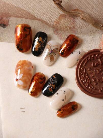 10片装亚克力美甲贴片,黑色、金色、亮棕色可选,蝴蝶花朵图案,短款,包含1张粘性贴片和1个迷你指甲锉。 - 彩色 - 查看 8