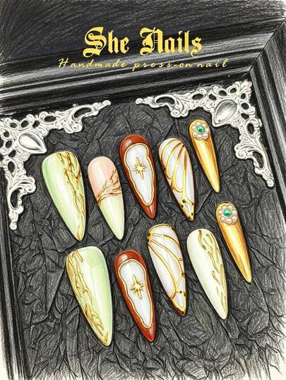 10件套可爱巴洛克朋克摇滚Y2K哥特风美甲套装,包含东西方风格的金属光泽美甲贴片、蓝色美甲贴片、绿色美甲贴片、手工制作的亚克力尖头美甲贴片,饰有豹纹、斑马纹3D浮雕钻石装饰,适合性感酷女孩派对装扮,附赠美甲凝胶贴纸和指甲锉。