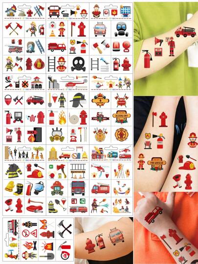 10入組消防員圖案刺青貼紙,消防車、滅火器卡通設計暫時性手部、面部和身體刺青貼紙 - 紅色 - 查看 1