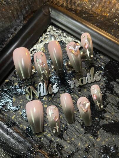10片手工亚克力美甲贴纸,棺材形美甲,粉色美甲,黑色扎染,3D彩色钻石美甲装饰,手绘星形图案,彩色闪亮爱心美甲贴,Y2K风格可穿戴美甲套装,适合女性日常、派对、节日和主题派对使用(包含:1片果冻胶和1片摩擦条)美甲用品 - 粉色 - 查看 3