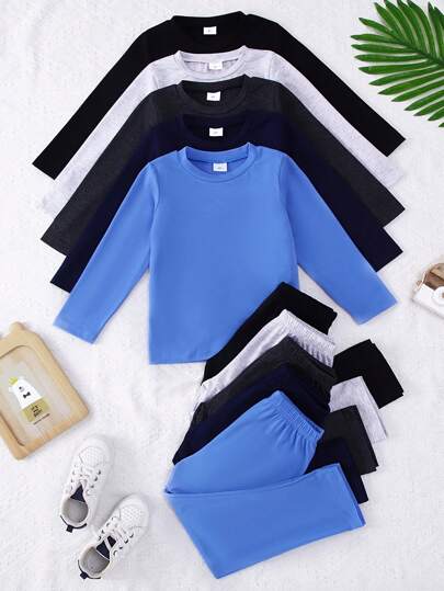 10件套男童纯色休闲柔软舒适轻盈针织长袖T恤和裤子套装,秋季款 - 彩色 - 查看 1