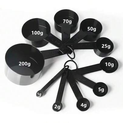 10件套厨房量具套装,包括量匙、茶匙、糖勺、蛋糕烘焙量勺、面粉量杯等。 - 黑色 - 查看 1