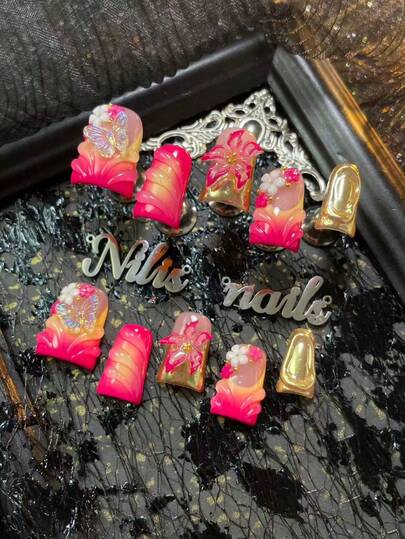 10件套短款鸭子美甲亚克力套装,玫瑰红、金色、粉色美甲,玫瑰红、金色法式美甲,黄色扎染,3D立体花朵、蝴蝶、钢珠美甲配件装饰设计,手绘铬粉几何图案,Y2K风格美甲套装,适合女性和女孩,节日、日常生活、聚会等场合,配备1个迷你指甲锉和1个双面胶标签美甲用品 - 玫紅色 - 查看 1