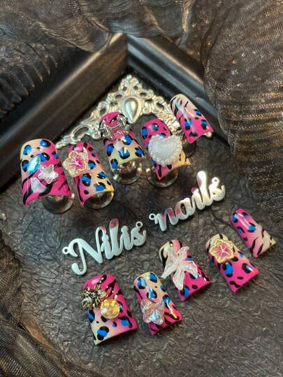 10片装短鸭子美甲套装,玫瑰红黄扎染,3D立体爱心、花朵、蝴蝶结和彩色钻石美甲装饰配件,手绘蓝纹和几何图案设计,Y2K风格美甲套装,适合女性日常佩戴、派对和情人节(包含:一片果冻胶和一条摩擦条)手工制作的按压式美甲 - 玫紅色 - 查看 8