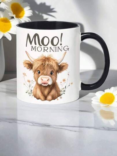 11盎司马克杯 - 高地奶牛图案,印有“哞!早上好”字样,优质陶瓷,可爱农场主题杯 - 黑色 - 查看 1