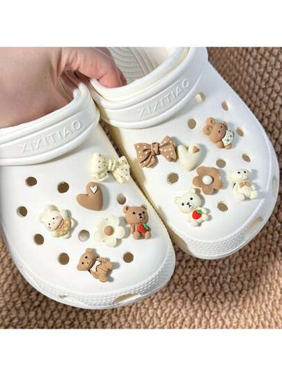 12 件可爱动物和花卉鞋饰套装 - 可爱的熊、兔子、心形和蝴蝶结设计,柔和的色彩,耐用的 ABS 材质 - 非常适合 DIY 鞋定制和时尚配饰 - 棕色 - 查看 7