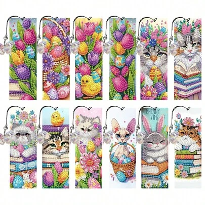 12件/套 DIY钻石画书签 - 郁金香和小猫图案,多色马赛克装饰 - 查看 11